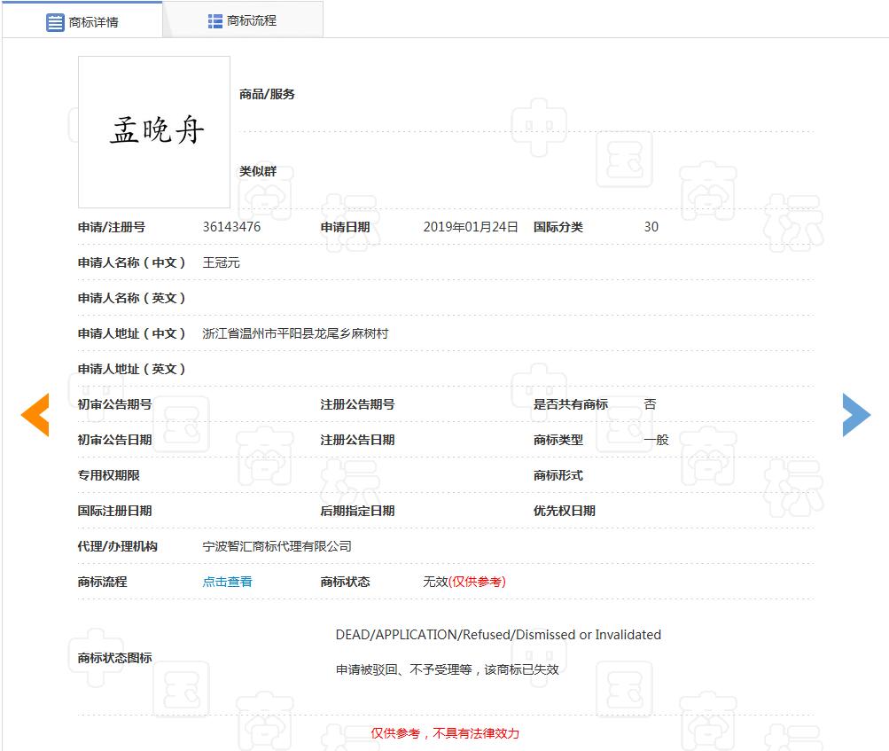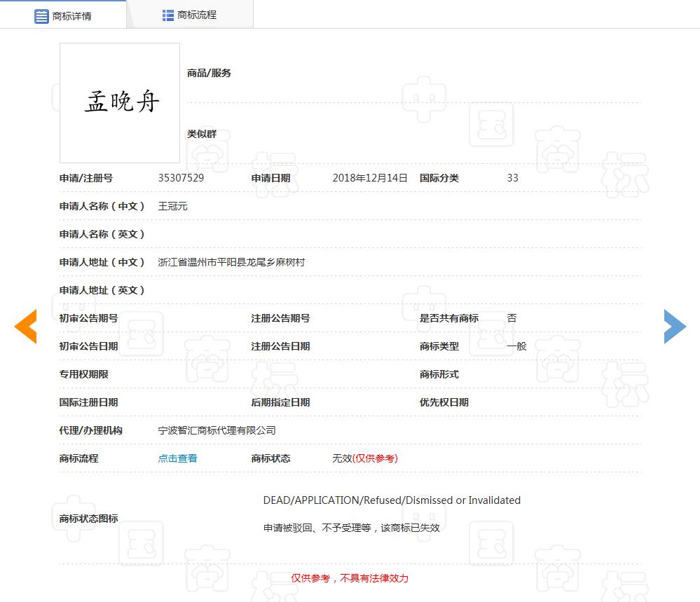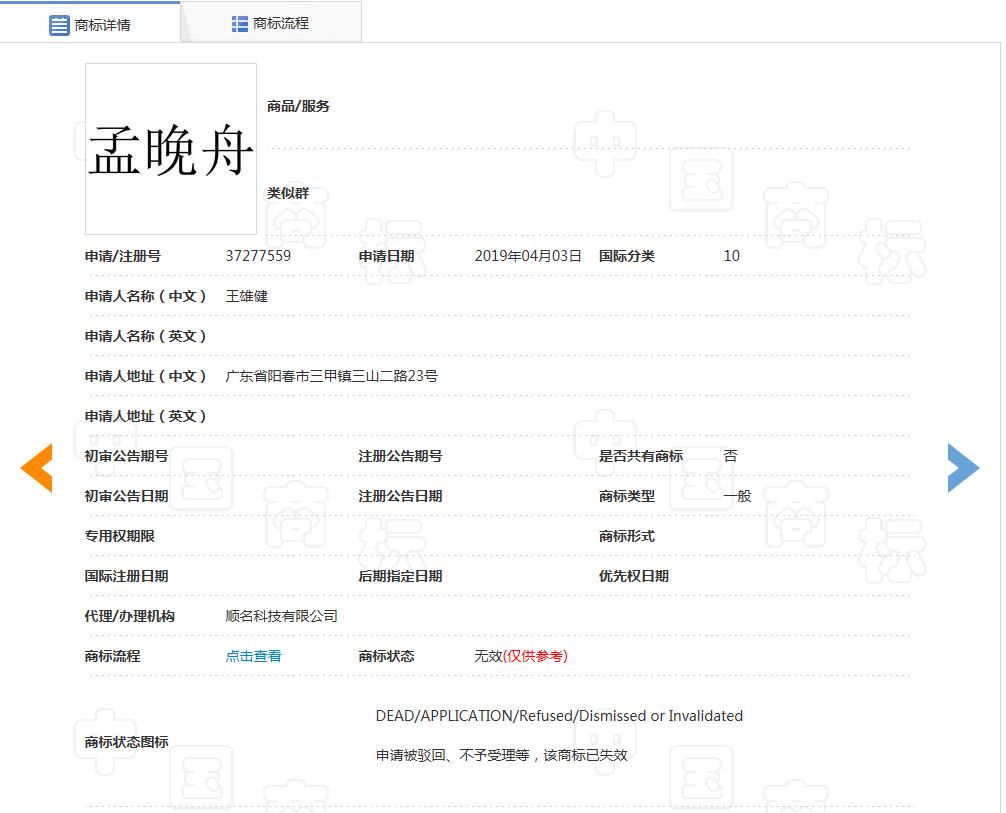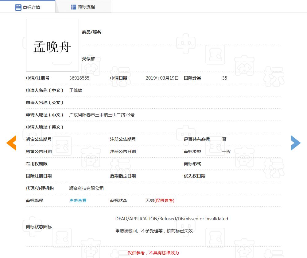中国商标网商标查询显示,“孟晚舟”商标此前被多人申请注册,国际分类包括广告销售、医疗器械等,商标申请日期在2018年12月-2019年4月之间。