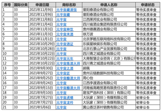 同样元宇宙概念在酒行业也深受追捧。中国商标网显示,涉及第33酒类商标达21件。