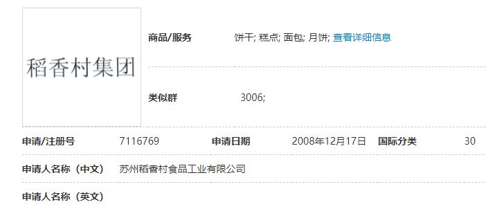相关判决书显示,本次诉讼涉及的“稻香村集团”商标系苏州稻香村食品工业有限公司于2008年申请注册,注册号7116769,核定使用商品范围为“饼干;糕点;面包;月饼”,专用权期限自2010年7月14日至2020年7月13日。